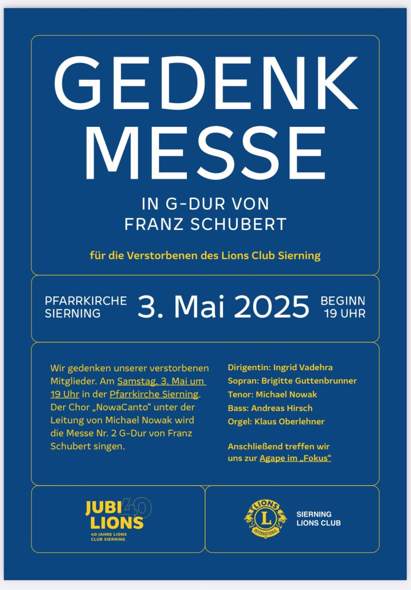 Am 3. Mai 2025 fand in der Pfarrkirche Sierning eine Gedenkmesse für die verstorbenen Mitglieder des Lions Club Sierning statt. Die musikalische Gestaltung übernahm der Chor NowaCanto unter der Leitung von Michael Nowak.